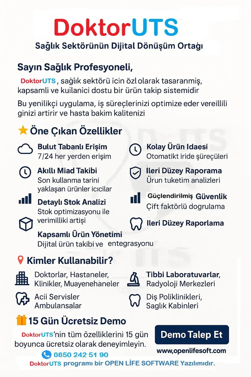 Diş poliklinikleri için ÜTS takibi, yalnızca yasal bir yükümlülük değil, aynı zamanda hasta güvenliği ve etkili stok yönetimi açısından da hayati önem taşımaktadır. DoktorÜTS, web tabanlı yapısı, detaylı takip özellikleri ve kullanım kolaylığı ile bu süreçleri etkin bir şekilde yönetmenizeOpen Life Software