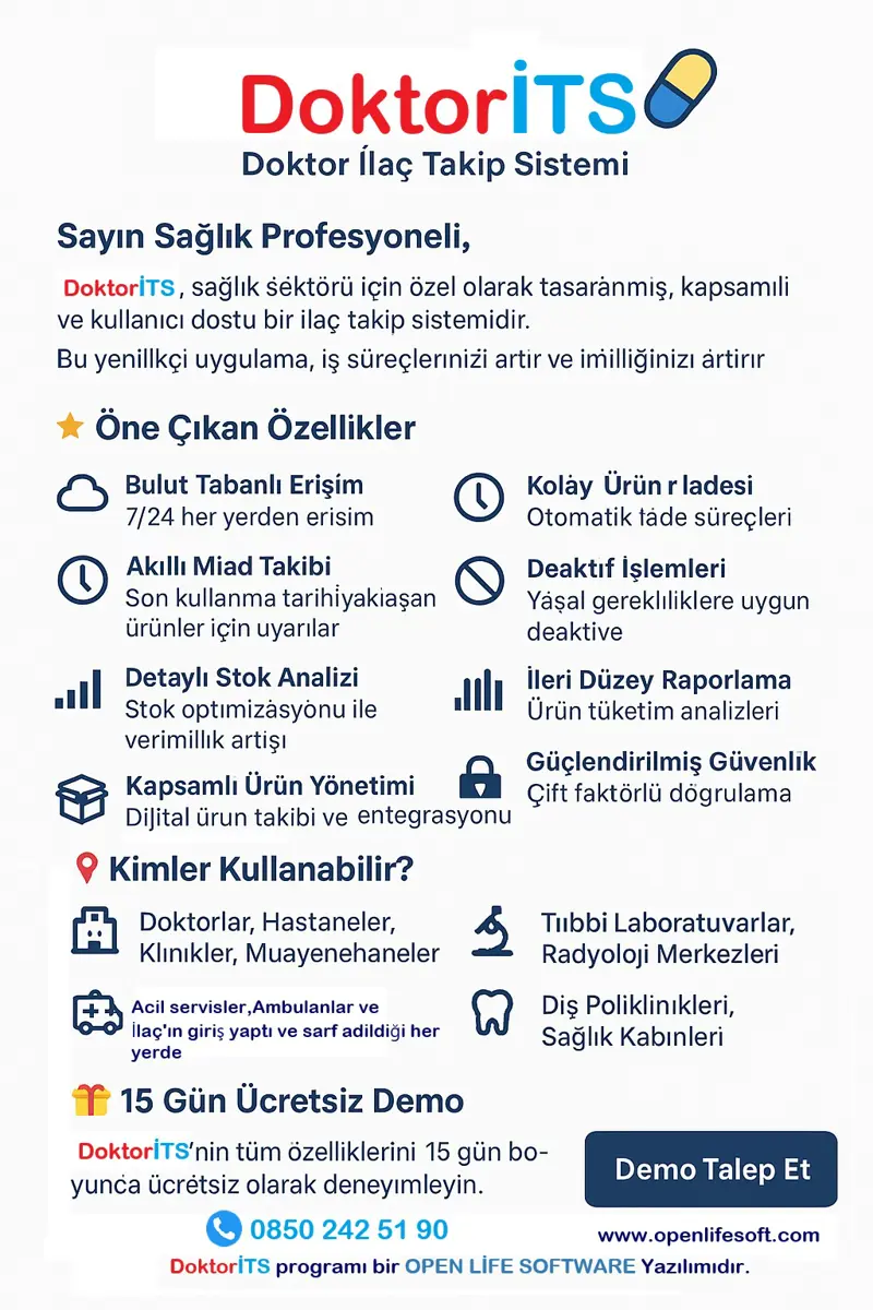 Doktor İTS Programı, Open Life Software projesi olarak, arada kalan ilaçların alımını ve stok takibini en verimli şekilde yapmanızı sağlar. Stoktaki sarf bildirimimde doğru şekilde yapmanızı sağlar Web tabanlı yapısı sayesinde internetin olduğu her yerden erişim imkânı sunarak, tüm süreçlerinizi kolaylaştırır. PTS transferi ve Sağlık Bakanlığı ile tam entegrasyonu ile güvenilir ve etkili bir çözüm arayanlar için, Open Life Software mükemmel bir tercih olacaktır.